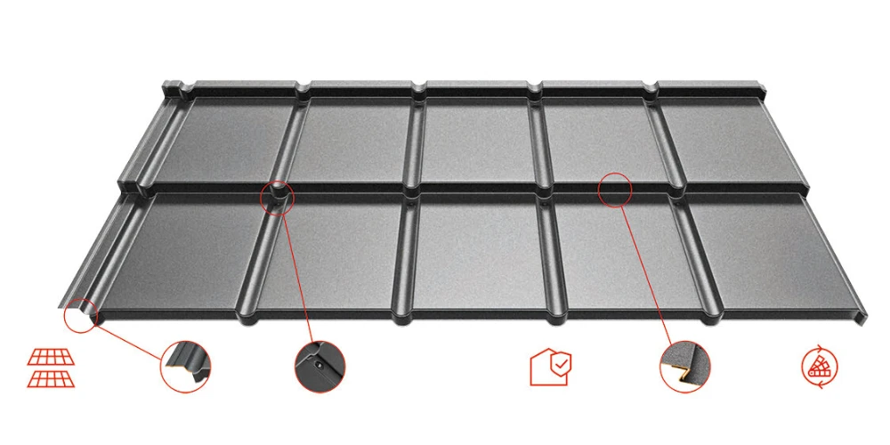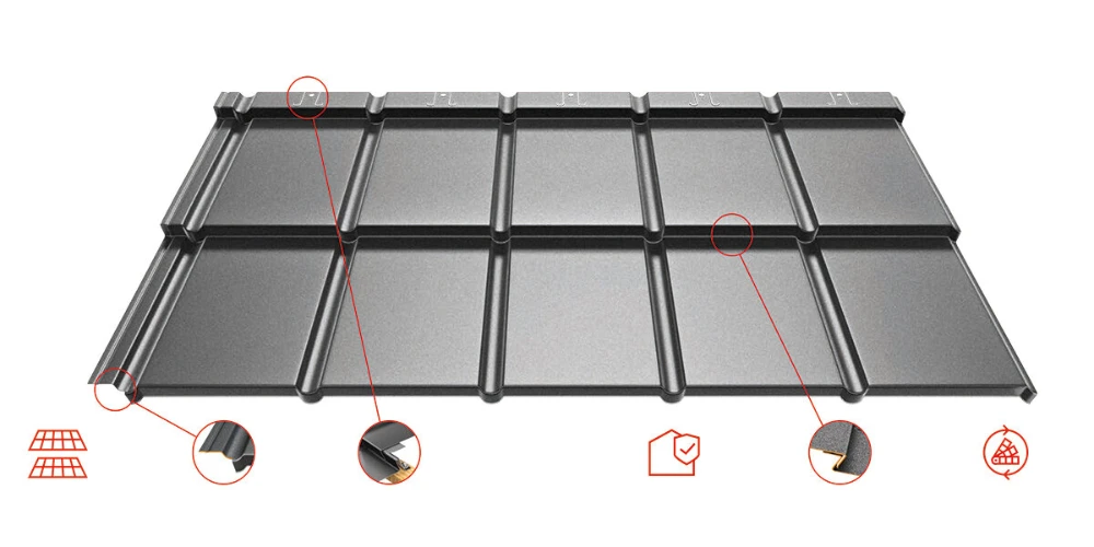 Az IZI cserepeslemez egy kétmodulos fémcserép, melynél a legapróbb részleteket is figyelembe véve alkottunk meg. Tökéletesen sima felülete szerény eleganciával és futurisztikus jellegével nyűgöz le. Időnek és múló trendeknek ellenálló tetőfedést képezve. Utánozhatatlan forma, egyszerű és gyors felhelyezés, kivételes tartósság, „Z” típusú borda, valamint ismétlődő szín és struktúra. Ezek az IZI, előnyei, melyeket akár 55 év garancia igazol.